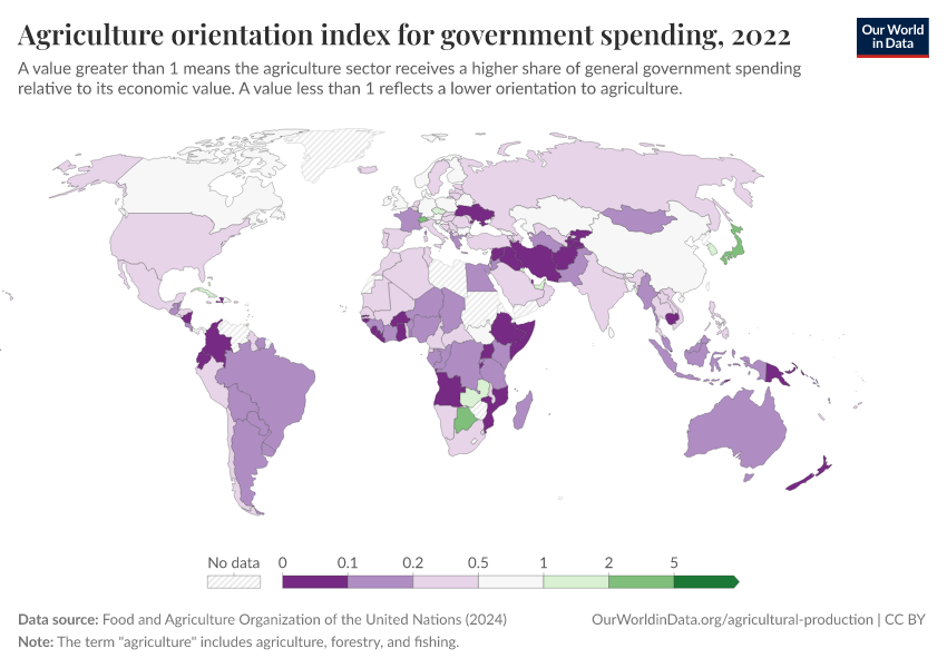 The agriculture orientation index (AOI) is the agriculture share of government expenditures, divided by the agriculture share of GDP.