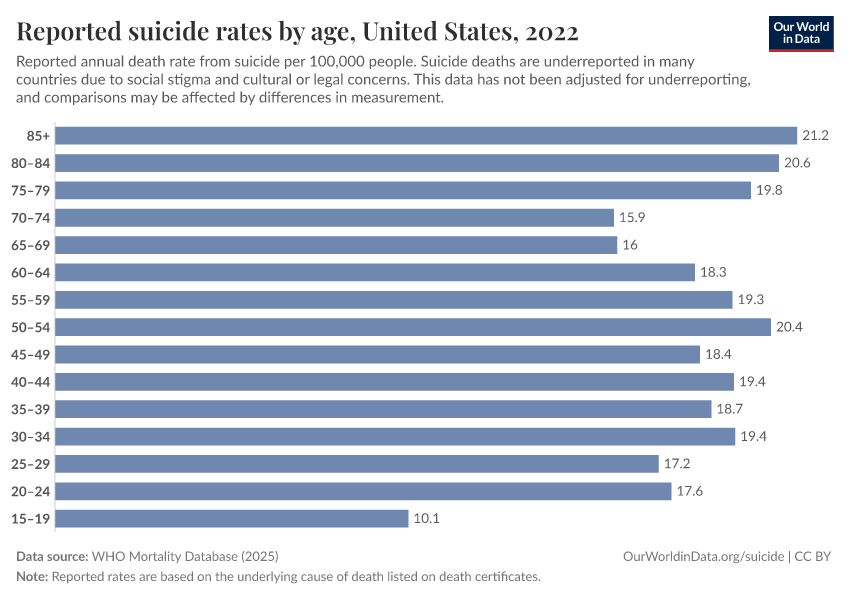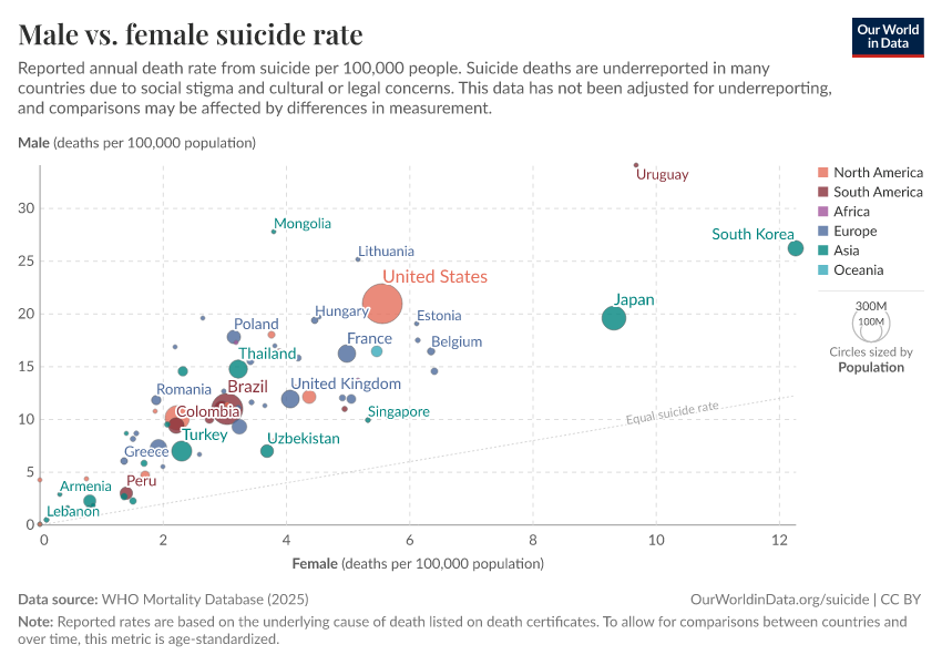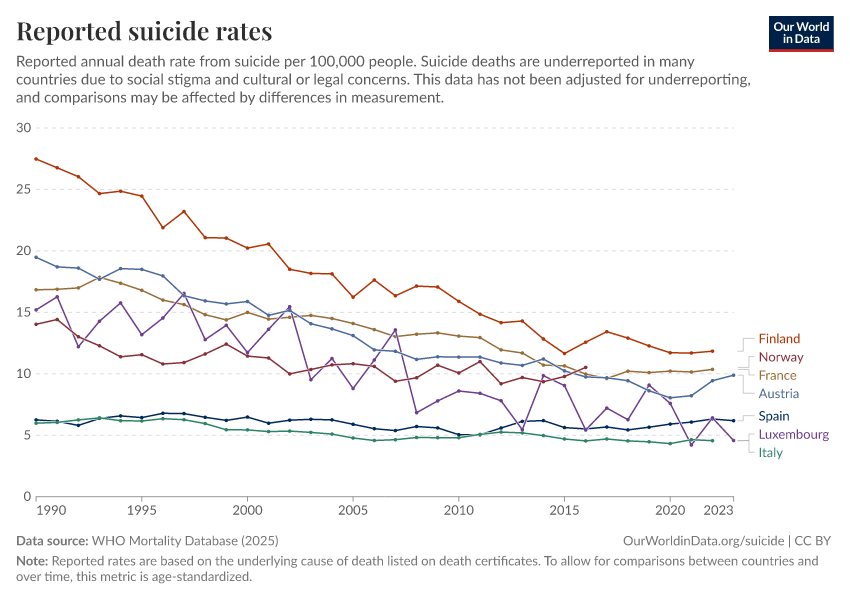 Saloni Dattani, Lucas Rodés-Guirao, Hannah Ritchie, Max Roser, and Esteban Ortiz-Ospina (2023) - “Suicides” Published online at OurWorldinData.org. Retrieved from: 'https://data-lexicalindex-indicators.owid.pages.dev/suicide' [Online Resource]BibTeX citation