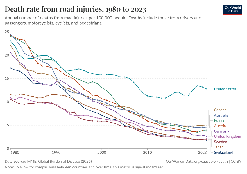 The chart shows that in many countries road deaths are at least 50% less common.