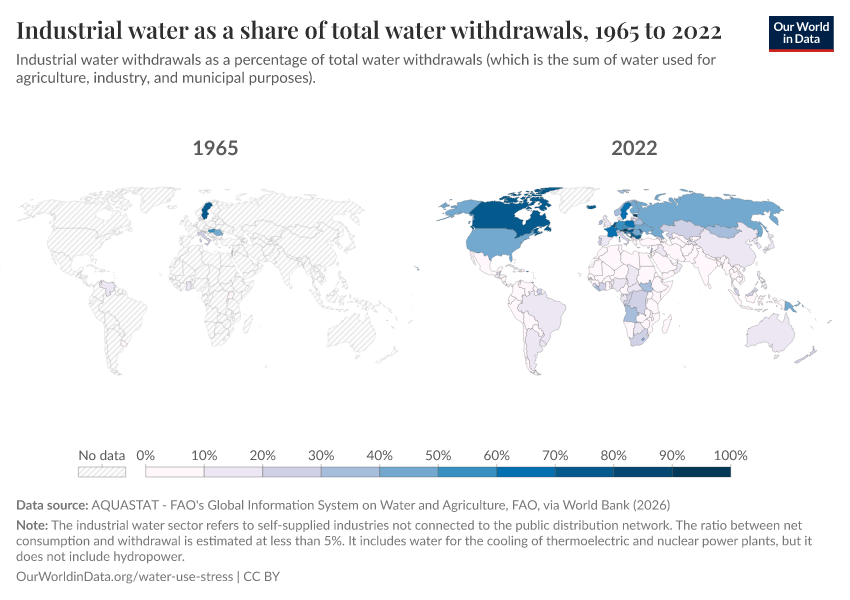 The visualization provides an overview of industrial water withdrawals measured as the share of total water withdrawals (which is the sum of agricultural, industrial, and domestic uses).